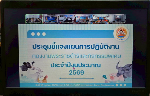 วันที่ 16 ตุลาคม 2568 เวลา 09.00 น. นายธีรวิทย์ ขาวบุบผา ผู้อำนวยการกองงานพระราชดำริและกิจกรรมพิเศษ เป็นประธานการประชุมชี้แจงแผนการปฏิบัติงานประจำปีงบประมาณ 2569 กองงานพระราชดำริและกิจกรรมพิเศษ โดยเจ้าหน้าที่ส่วนส่งเสริมและพัฒนาการปศุสัตว์ สำนักงานปศุสัตว์เขต 6 เข้าร่วมการประชุมฯ เพื่อรับทราบนโยบายและแนวทางการดำเนินงานโครงการของกองงานพระราชดำริและกิจกรรมพิเศษ ประจำปีงบประมาณ 2569 ผ่านระบบ Zoom Meeting ณ ห้องประชุมบางแก้ว สำนักงานปศุสัตว์เขต 6 อำเภอเมือง จังหวัดพิษณุโลก