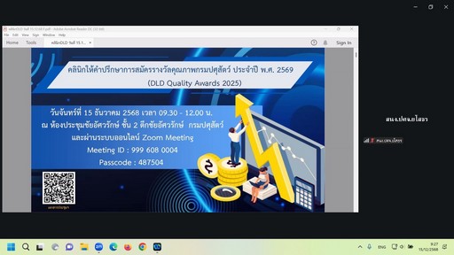 วันที่ 15 ธันวาคม 2568 เวลา 9.30 น. นายสมเกียรติ กรอบแก้ว หัวหน้ากลุ่มพัฒนาระบบบริหาร เป็นประธานการประชุมคลินิกให้คำปรึกษารางวัลคุณภาพกรมปศุสัตว์ ประจำปี 2569 ( DLD Quality Awards 2026) เพื่อให้คำปรึกษาแก่หน่วยงานเกี่ยวกับการเขียนผลงานส่งสมัครรางวัลคุณภาพกรมปศุสัตว์ ประจำปี 2569 ( DLD Quality Awards 2026) ในการนี้ เจ้าหน้าที่ส่วนยุทธศาสตร์และสารสนเทศการปศุสัตว์ เข้าร่วมประชุมผ่านทางระบบ Zoom Meeting ณ ห้องประชุมบางแก้ว สำนักงานปศุสัตว์เขต 6 อำเภอเมือง จังหวัดพิษณุโลก