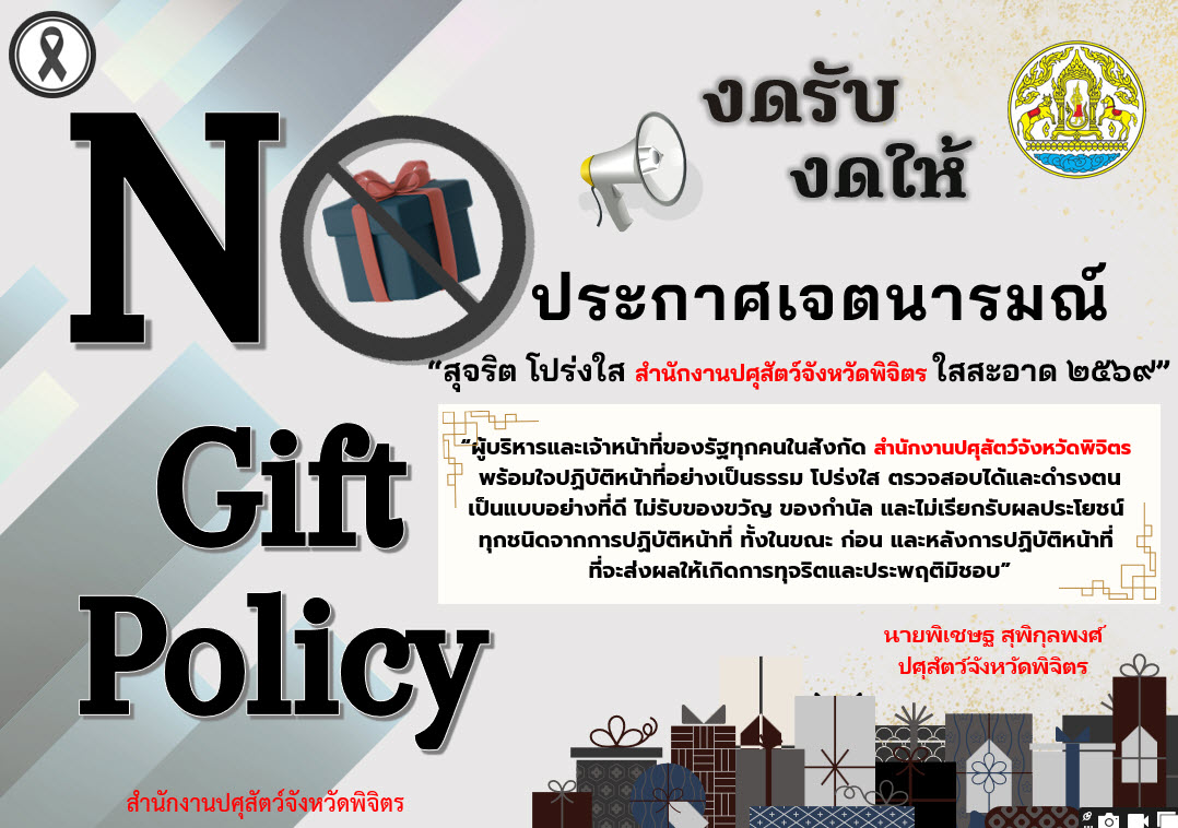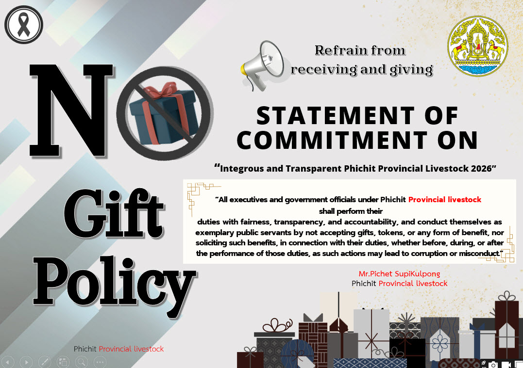 • ประกาศเจตนารมณ์ เรื่อง “สุจริต โปร่งใส สำนักงานปศุสัตว์จังหวัดพิจิตร ใสสะอาด 2569” และ “งดรับ งดให้” ของขวัญ ของกำนัลทุกชนิดจากการปฏิบัติหน้าที่ (No Gift Policy)