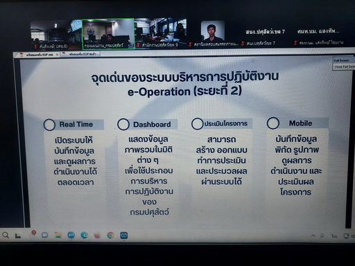 วันที่ 17 พฤศจิกายน 2568 เวลา 13.00 น. เจ้าหน้าที่จากกองแผนงานเป็นวิทยากร ในการบรรยาย การประชุมทบทวนการใช้งาน ( e-Operation) ผ่านทางระบบประชุมทางไกล Zoom Conference โดยมี เจ้าหน้าที่ผู้รับผิดชอบ ของแต่ละส่วนฯ/ฝ่าย ฯ เข้าร่วมประชุมณ ห้องประชุมสำนักงานปศุสัตว์เขต 6 ( ห้องบางแก้ว ) อำเภอเมืองจังหวัดพิษณุโลก